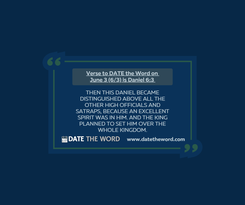 Verse to DATE the Word on June 3 (6/3) is Daniel 6:3. It says, “Then this Daniel became distinguished above all the other high officials and satraps, because an excellent spirit was in him. And the king planned to set him over the whole kingdom.”