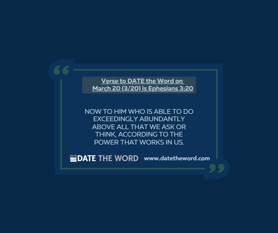 Verse to DATE the Word on March 20 (3/20) is Ephesians 3:20. It says, “Now to Him who is able to do exceedingly abundantly above all that we ask or think, according to the power that works in us,”